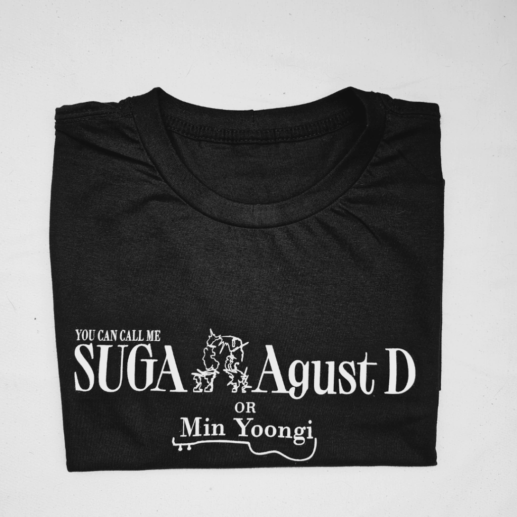 Frente: "You can call me SUGA, AgustD or Min Yoongi" (tradução: Você pode me chamar de...).